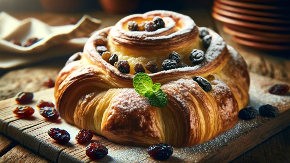 - รีดแป้ง 30×40 ซม. โรยด้วยเนย แช่แข็งขูด น้ำตาลทราย ลูกเกด แล้วพับ 3 ทบ ตัดแบ่งเป็นเส้นยาว 10 เส้น บิดเกลียวแล้วม้วนเป็นก้นหอย แล้วพักแป้งให้ขึ้น